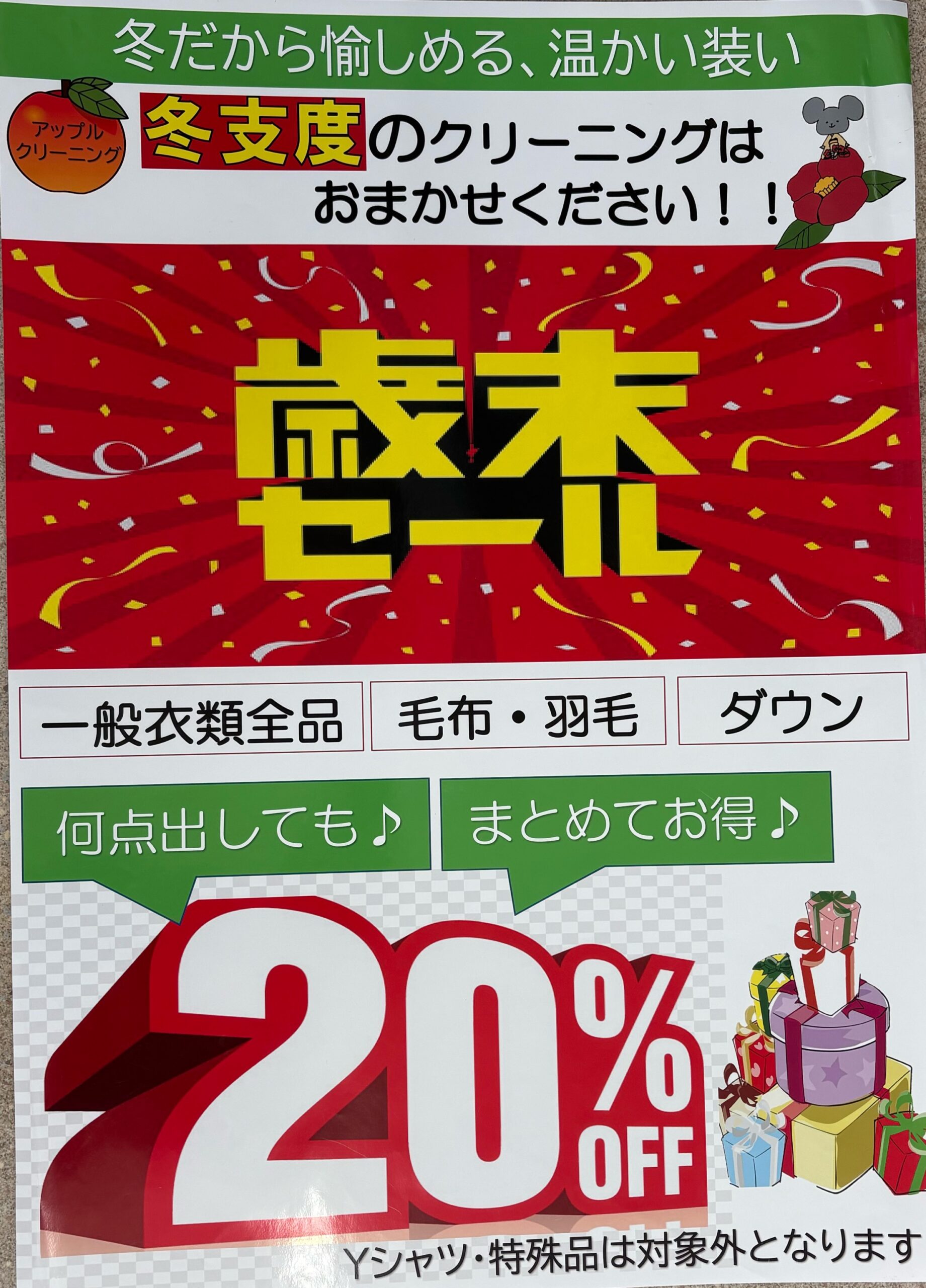 12/10(水)~12/27(土)まで今年最後の感謝を込めて・・・ 20%OFF SALE開催! 今年の汚れは今年のうち...